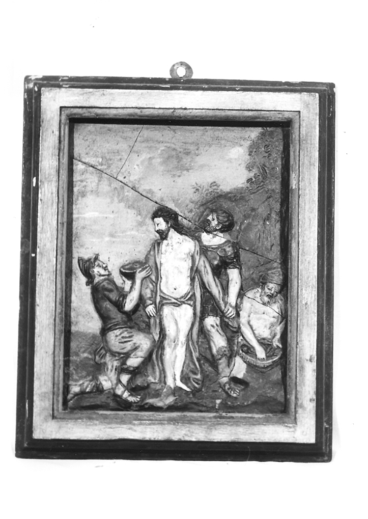 Personaggi: Gesù Cristo. Figure: carnefice; soldato; astante. Strumenti del martirio: croce; corona di spine; vassoio con fiele. Paesaggi