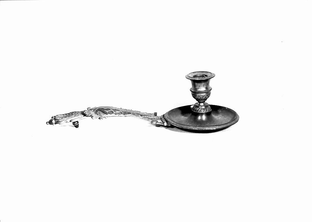 Palmatoria con piattelo circolare, fusto a vaso ed impugnatura decorata da motivi fitomorfi, terminante con elemento vegetale a giorno