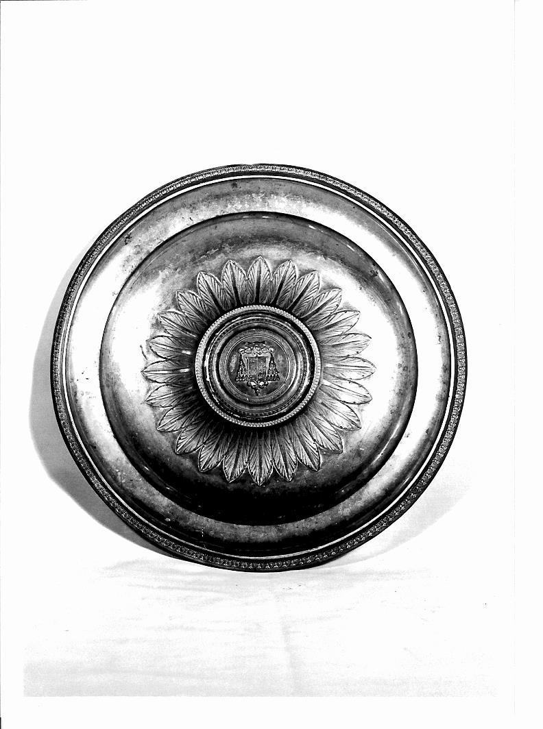 Bacile circolare con orlo decorato da palmette; al centro del cavetto una corona di foglie circonda lo stemma Lucciardi: scudo sannitico ornato da contrassegni della dignità cardinalizia; campo: partito, nel primo spaccato di quattro: a) alla croce; b) all'aquila bicipite spiegata e coronata; c) alla fascia scaccata; d) alle tre corone bene ordinate; nel secondo al'aquila spiegata e coronata con fiore nel becco e ghermente aquila floreale