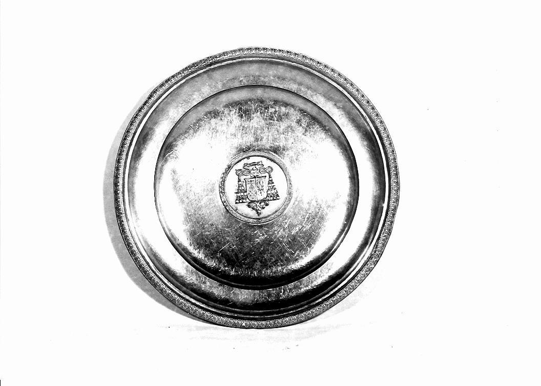 Piatto rotondo con orlo decorato da palmette; al centro lo stemma cardinalizio dei Lucciardi: scudo sannitico ornato da contrassegni della dignità cardinalizia; campo: partito, nel primo spaccato di quattro: a) alla croce; b) all'aquila bicipite spiegata e coronata; c) alla fascia scaccata; d) alle tre corone bene ordinate; nel secondo al'aquila spiegata e coronata con fiore nel becco e ghermente aquila floreale