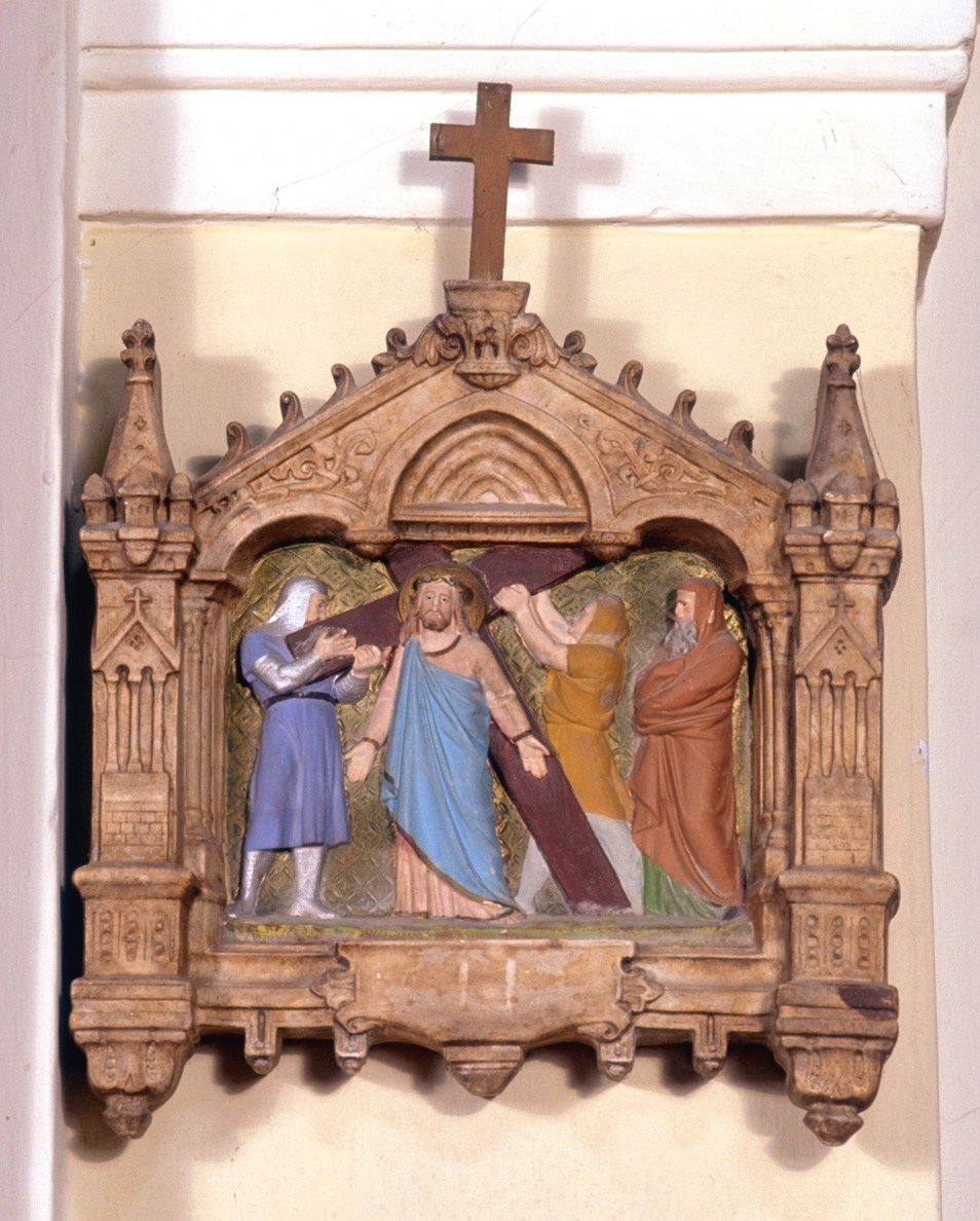 Formella in gesso dipinto delimitata da una cornice architettonica neogotica con pinnacoli