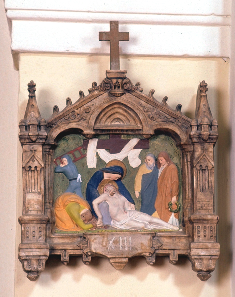 Formella in gesso dipinto delimitata da una cornice architettonica neogotica con pinnacoli