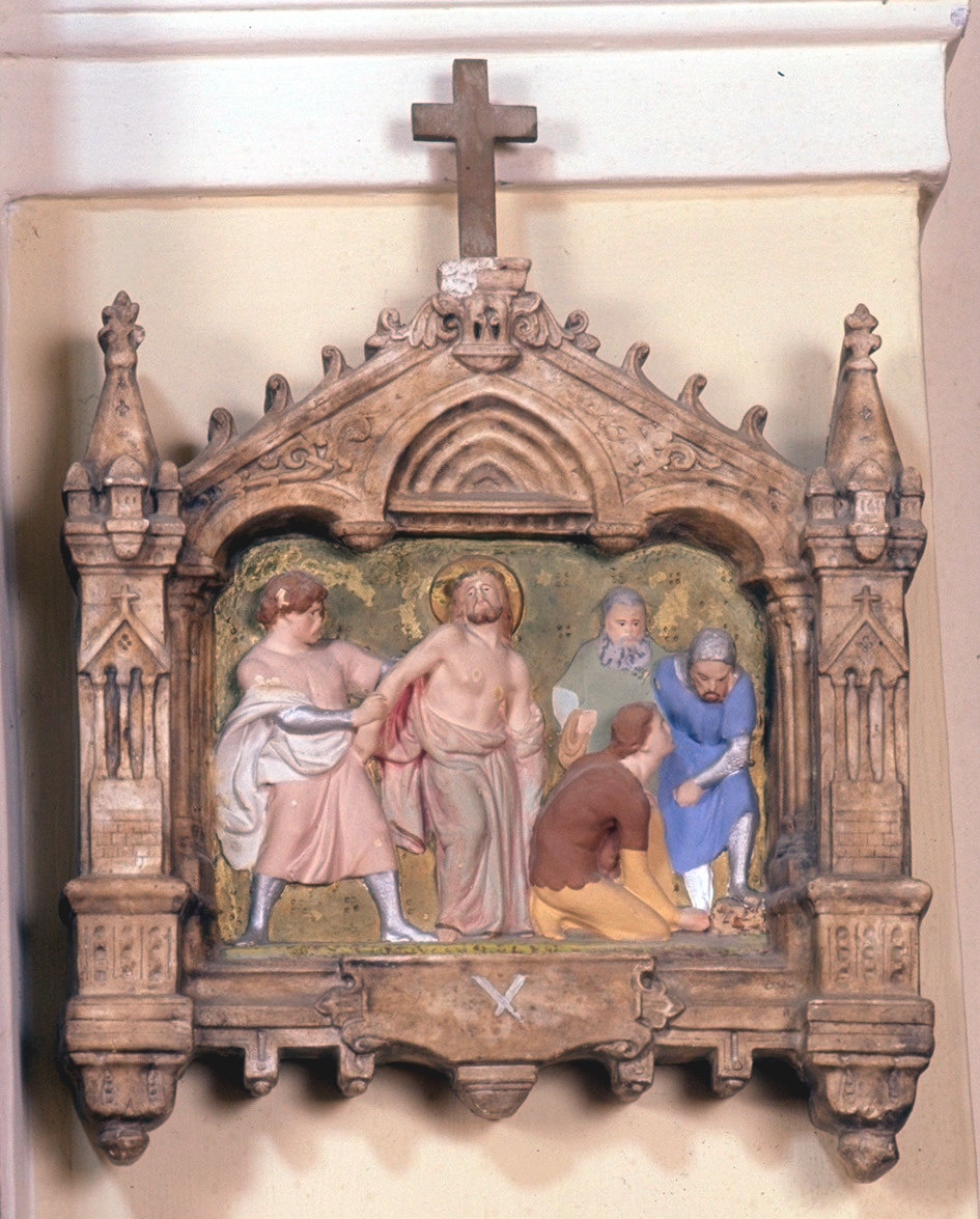 Formella in gesso dipinto delimitata da una cornice architettonica neogotica con pinnacoli