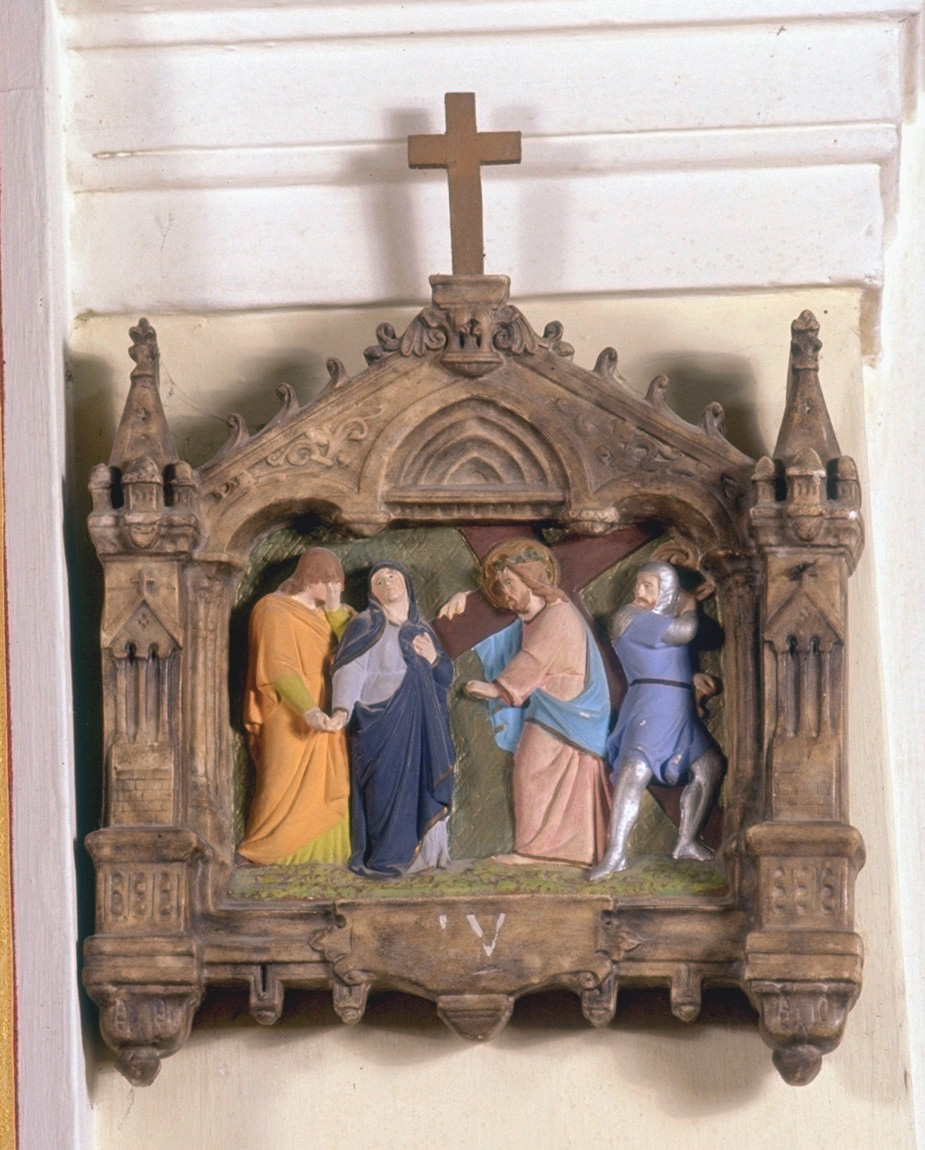Formella in gesso dipinto delimitata da una cornice architettonica neogotica con pinnacoli