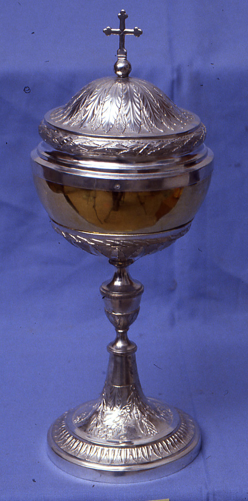 Base circolare decorata a foglie e simboli eucaristici; stelo con nodo a vaso e sottocoppa a foglie di alloro; coppa liscia; coperchio a cupoletta con decorazioni a corona di alloro e calotta di foglie sovrapposte; coronamento con palla e croce