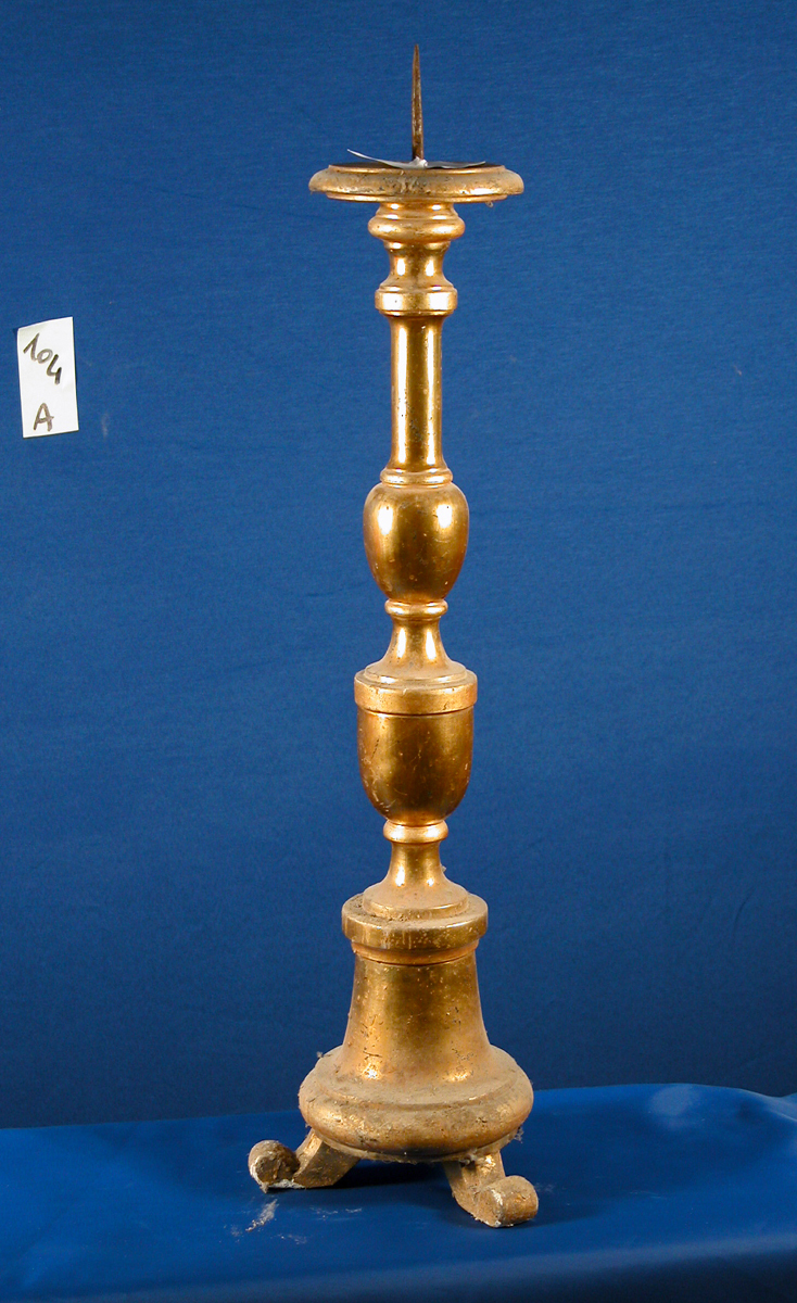 Piedini a volute, base a rocchetto, nodo vasiforme, stelo con pomo e anelli