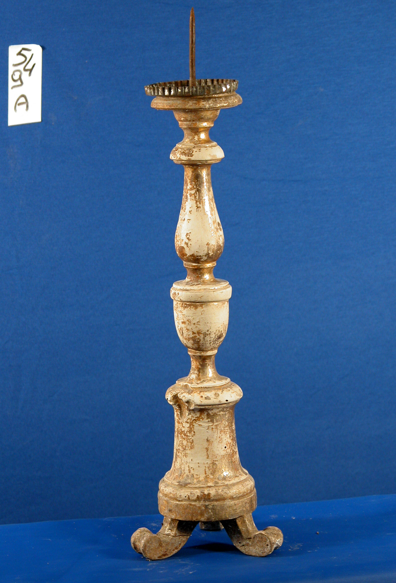 Su tre piedi a volute si innalza il candlierem in forme arrotondate sovrapposte con cornicette in aggetto