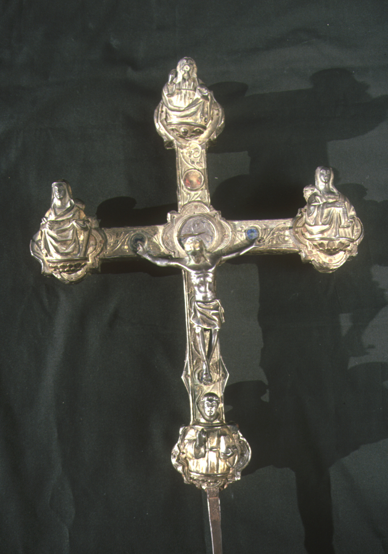 Croce con terminazioni con raffigurazioni di santi, poste su due tipologie di mensole diverse, una a fiore e una figurata. Bordi a losanghe con rosette al centro.Sulla croce sono incastonate alcune pietre colorate