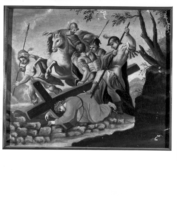Personaggi: Gesù Cristo. Figure: soldati; carnefice. Strumenti del martirio: croce; corona di spine. Armi: lance; elmi. Architetture: muretto. Animali: cavallo. Paesaggi: albero; cielo; monti