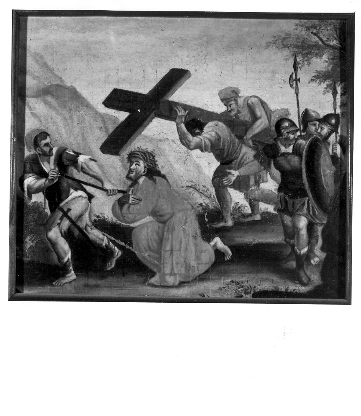 Personaggi: Gesù Cristo. Figure: soldati; carnefice; donne di Gerusalemme. Strumenti del martirio: croce; corona di spine; corda. Armi: lance; elmi. Animali: cane. Paesaggi: albero; cielo; monti