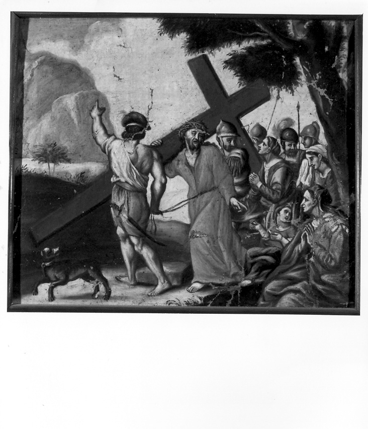Personaggi: Gesù Cristo. Figure: soldati; carnefice. Strumenti del martirio: croce; corona di spine; bastone. Armi: lance; elmi. Animali: cavallo. Paesaggi: albero; cielo; monti