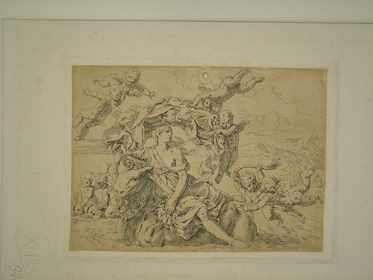 Soggetti profani: mitologia. Personaggi: Europa. Metamorfosi: Giove/ toro. Figure: putti; figure femminili. Oggetti: ghirlanda. Paesaggi: marina