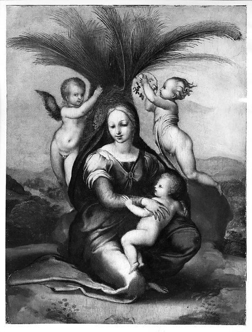 - NOTIZIE STORICO CRITICHE L'opera, esposta in una delle sale della Casa natale di Raffaello ad Urbino, ha acceso in passato una forte diatriba tra gli storici e critici d' arte riguardo la sua paternità. Il quadro fu acquistato nel 1968 dal Consiglio Superiore delle Antichità e Belle Arti come opera di Raffaello Sanzio per la somma di trenta milioni di lire ed esposta nel 1973 durante la mostra "Restauri nelle Marche"allestita nel Palazzo Ducale di Urbino con la denominazione "Madonna della Palma". Federico Zeri pubblicò a proposito un articolo con toni molto accesi: "Non appena esposta al pubblico, la tavola suscitò grande sorpresa e commenti per la miseria dell'invenzione, la qualità abominevole del pigmento pittorico, l'incongruenza del tema iconografico e dell'anatomia delle due figure principali suggeriscono a colpo d'occhio non la mano del Sanzio, ma quella di un suo seguace assai distante e tardo.." Oltre a mettere in discussione la paternità dell'opera al Sanzio, Zeri sottolinea l'errata datazione cronologica sospettando di un falso eseguito nella prima metà dell'Ottocento. Ciò risultava essere supportato dalla tesi esposta da storici dell'arte americani, che hanno chiamato la tavola Captain Cook's Raphael, in quanto osservarono che il peculiare innesto delle fronde sul tronco del vegetale, che si trova al centro, non è una palma bensì una Cycas revoluta, cioè una pianta che è originaria del Pacifico, e soprattutto delle terre esplorate dal capitano Cook 250 anni dopo la morte di Raffaello. A detta di Zeri, quindi l'autore "del bidone urbinate deve aver visto un esemplare di Cycas in qualche orto botanico, scambiandolo per una palma". Attualmente l'opera è esposta come produzione realizzata in ambito italiano nella prima metà del XIX secolo. La tavola è denominata "Madonna con il Bambino", in cui si vede la figura della Vergine che regge il Bambino accasciata sotto un vegetale,dal quale due putti stanno raccogliendo frutti