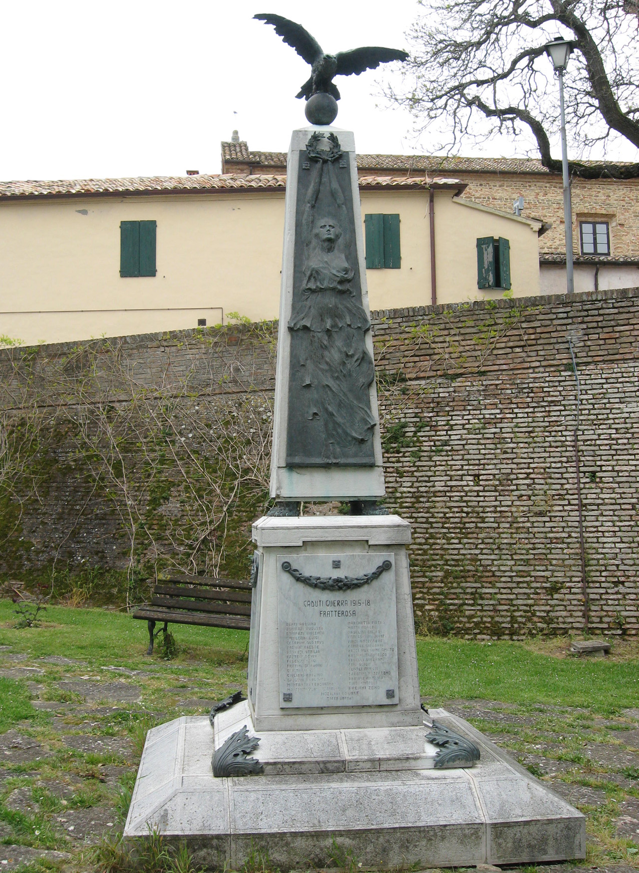 - ISCRIZIONI sulle quattro lastre murate sulle facce del plinto di basamento dell'obelisco - (Sulla lastra anteriore:) CADUTI GUERRA FRATTE ROSA 1915-18 (elenco a sinistra:) BERTI ARDUINO BONIFAZI AUGUSTO BONIFAZI VINCENZO CAMILLONI LUIGI CESARINI GUSTAVO FABIANI ORESTE FAGOTTI ATTILIO FRATESI SANTE FEDERICI LUIGI FRATINI GIOVANNI GIUSTI LUIGI GIULIANI ANTONIO GRESTINI DOMENICO MONTANARI FERDINANDO MONTEMAGGIORI NAZZARENO (elenco a destra:) MARCHETTI PIETRO MASSI ADOLFO ORSOLINI EMILIO PATREGNANI QUINTO PINZI NAZZARENO POMPILI GIOVANNI ROSSI MERCANTE AMATO ROSSINI FRANCESCO RENELLI GIOVANNI RENI GUIDO REGOLI ATTILIO SABATINI NAZZARENO TRAIANI ANTONIO TINTI ANTONIO FABIANI ZENO ( al centro: ) NOBILINI CESARE POETA URBANO ( nella lastra a sinistra del monumento:) CADUTI GUERRA 1915-18 FRAZIONE TORRE S.MARCO BERARDI DOMENICO BINDELLA MARIANO CAPOCCI GIUSEPPE CARDINALI GIOVANNI CAMPOLUCCI ERNESTO CLEMENTI ATTILIO GHILARDI PAOLO PAOLUCCI CESARE RAGNOTTI PRIMO SIMONCELLI AMEDEO SIMONCELLI MARIANO TINTI NAZZARENO FU GIUSEPPE TINTI NAZZARENO FU LUIGI TOMASETTI FRANCESCO VENANZI IVO SIMONCELLI GUERRINO ( nella lastra della parete opposta a quella frontale) CADUTI GUERRA 1940-44 COMUNE DI FRATTE ROSA ( elenco a sinistra:) AVALTRONI AMATO BARTOLI DALMAZIO BONCI BENITO BONCI SANTE BUSSAGLIA ENRICO COLI FRANCESCO FEDUZI ENZO MULERI GUERRINO PANDOLFI SESTO POLIERI ELIO POLIERI PIERO ROMITI GALIANO ROSCINI VEDASTO SANTINELLI SETTIMIO ( elenco a destra:) SANTINI ARDUINO SIMONCELLI QUINTO SPERANZINI CLAUDIO STORONI GIUSEPPE VALENTINI SESTO ( nella lastra a destra del monumento:) VITTIME CIVILI GUERRA 1940-44 COMUNE DI FRATTE ROSA PIERPAOLI ELENA PIERPAOLI SECONDO PLATANO EMILIA SIGNORACCI DIVA SIGNORACCI NICE SILVESTRINI PALMA SIMONCELLI DIONISIO - a incisione -
