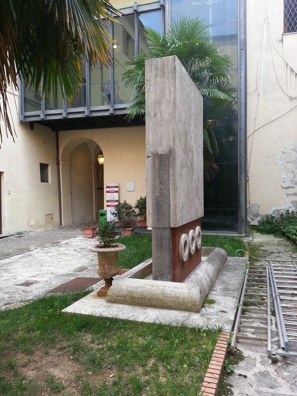 Il parallelepipedo in marmo con iscrizione è sostenuto da un basamento in muratura a facciavista con tre fori circolari rivestiti in marmo. La stele è posta all'interno di una vasca rettangolare in marmo dove in origine era raccolta l'acqua. Nel mezzo dell'iscrizione è posto il decoro bronzeo del ramo di quercia