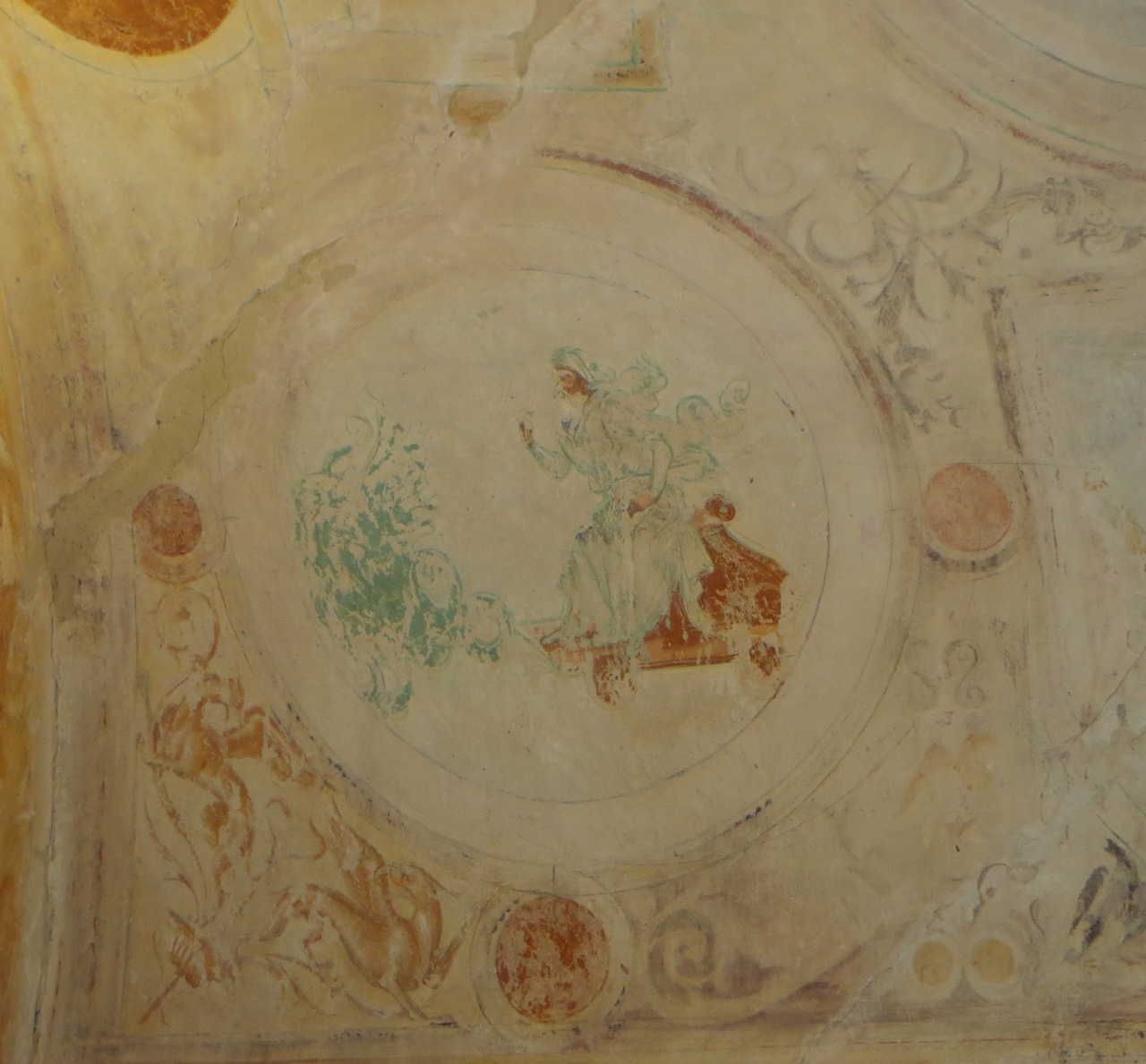 - NOTIZIE STORICO CRITICHE Nel 1493 Giovanni Sforza, signore di Pesaro dal 1483 al 1512, sposò Lucrezia Borgia figlia di papa Alessandro VI, Rodrigo Borgia. Il soggiorno pesarese di Lucrezia fu breve e si colloca temporalmente all’indomani delle nozze romane con Giovanni, nel 1494. Il terminus post quem per l’esecuzione degli affreschi dovrebbe essere concomitante o di poco successiva all’arrivo di Lucrezia Borgia a Pesaro, mentre come terminus ante quem si assume convenzionalmente l’anno 1497 in cui Giovanni Sforza divorziò dalla giovane donna. Attribuito prima a Girolamo Genga e successivamente ad Amico Aspertini, allo stato attuale degli studi e delle ricerche relative a questo ciclo pittorico non è ancora stato identificato con precisione l’esecutore. Gli affreschi presentano tuttavia una inequivocabile influenza della pittura di ambito bolognese (M. Faietti). Il cattivo stato di conservazione in cui ad oggi versa il ciclo pittorico è dovuto soprattutto alla tecnica esecutiva. Solo alcune porzioni furono infatti realizzate a fresco, mentre la gran parte dei dipinti presenta una tecnica esecutiva a secco. Quest’ultima si è dimostrata nei secoli maggiormente soggetta a deperimento con la conseguente perdita di consistenti porzioni di pellicola pittorica e formazione di lacune