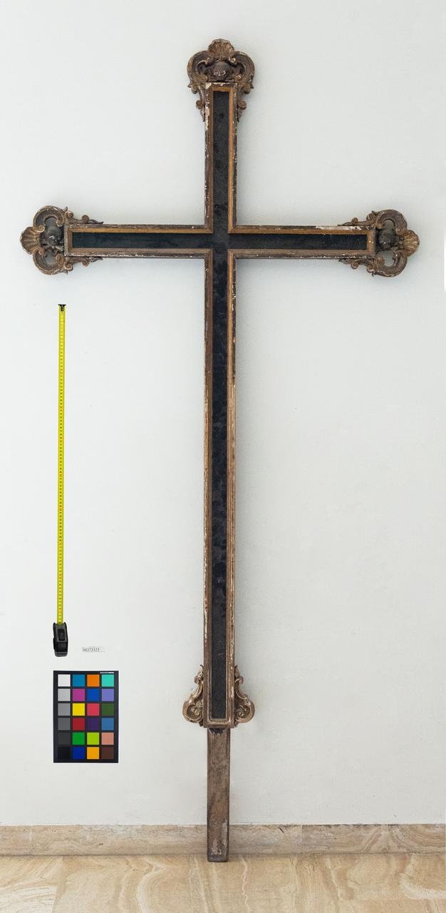Croce in legno dipinto a fondo nero con decorazioni dorate lungo i bordi e sulle volute agli apici dei bracci; sono presenti elementi decorativi ai bracci superiore e laterali in forma di globo su delle ossa incrociate. In molti punti lungo i bordi la vernice risulta scheggiata