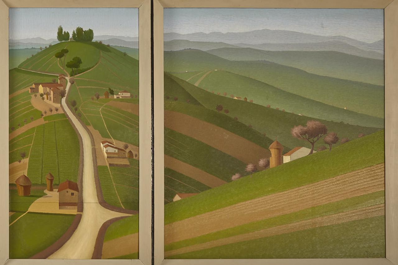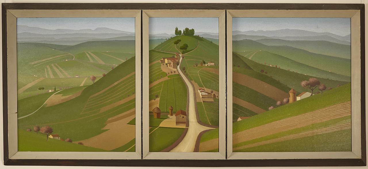 L'opera è composta da tre dipinti che compongono un trittico, rappresentate un paesaggio collinare marchigiano, costellato di case e fienili, mentre sullo sfondo si intravedono gli Appennini. Nel quadro centrale si estende una strada di campagna che si perde sulla sommità della collina protagonista della rappresentazione. La luce diffusa e i colori brillanti accentuano l'assenza di chiaroscuro