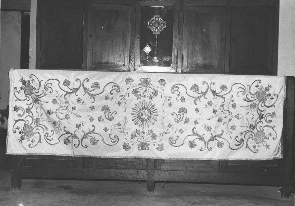 Velo in seta bianca con ricami in oro. La decorazione è a motivi barocchi con volute, rami e fiori, al centro è una raggera con il nome di Gesù