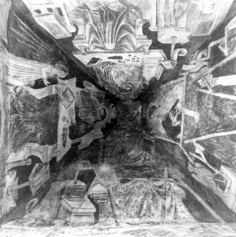 Personaggi: San Giovanni Evangelista; San Marco Evangelista; San Luca Evangelista; San Matteo Evangelista. Allegorie-simboli: (San Giovanni Evangelista) aquila; (San Marco Evangelista) leone; (San Luca Evangelista) bue; San Matteo Evangelista (angelo). Elementi architettonici: quattro troni cuspidati con scrittoi. Oggetti: libri; dipinto; pennello; colori; calamaio