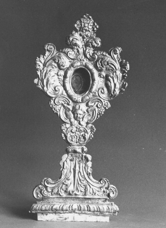 Basamento; fusto corto sagomato con elementi decorativi a foglie e volute; teca con cornice sagomata e testa di putto alato nella parte inferiore; croce greca apicale
