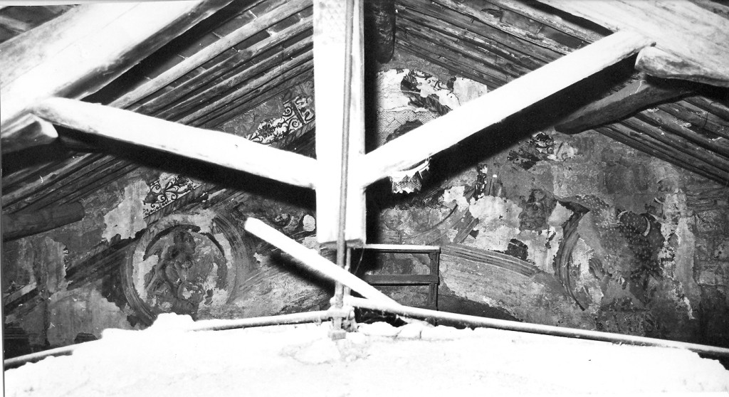 - NOTIZIE STORICO CRITICHE Lo schema compositivo della decorazione segue quella di più antichi affreschi sottostanti. L'impostazione generale con i tre tondi è ancora di carattere medioevale, mentre la cornice superiore si rialaccia ad esperienze rinascimentali. Il tondo centrale è stato sfondato per aprire un occhio nella muratura, ripristinando la situazione preesistente agli affreschi