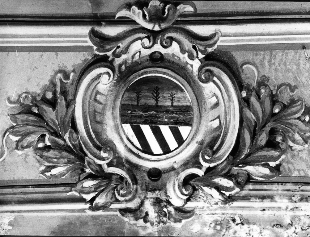 Entro una cornice dipinta a finto stucco, diviso in due campi: l'inferiore attraversato da strisce oblique bianche e rosse, mentre nella zona superiore sono raffigurati tre alberi presso un fiume contro un cielo crepuscolare