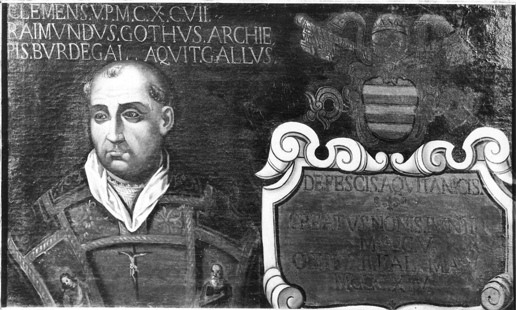- NOTIZIE STORICO CRITICHE E' questo il ritratto del pontefice Clemente V (1305-1314), una delle 265 tele che compongono il ciclo dedicato ai papi da S. Pietro a Giovanni XXIII. Ogni dipinto reca l'effigie del pontefice a mezzo busto, affiancato dallo stemma papale unito all'emblema pontificio (chiavi in decusse, tiara coronata e stola). I dipinti sono disposti in telai recanti ciascuno quattro tele. Sono ordinati cronologicamente in registri orizzontali su quattro ordini lungo le pareti di sei sale del Palazzo, in un'ala della costruzione eretta dopo l'acquisto del feudo di Oriolo da parte degli Altieri (1671) forse proprio per custodire questa collezione. Secondo le fonti bibliografiche (Pierotti E., "La galleria Altieri di Oriolo", Roma s.d., pp. 21-22) il nucleo primitivo di questa serie fu commissionato dal cardinal Paluzzo Altieri (1623-1698) durante il pontificato di Alessandro VII (1655-1667), il primo dei pontefici sul cui ritratto non compare la data di morte. Secondo la tradizione si ispirerebbero alla serie dei papi di S. Paolo fuori le mura, rispetto ai quali però la serie di Oriolo presenta numerose differenze, sia nel numero dei pontefici raffigurati che nella loro successione. Differenze sono inoltre riscontrabili anche con l'Annuario Ufficiale Pontificio. La serie dei dipinti rappresenta un insieme stilisticamente ed iconograficamente unitario. Non si notano evidenti differenze tra il primo gruppo di tele, fino cioè ad Alessandro VII, e quelle successive (Schiavo V., "Palazzo Altieri", Roma 1964, pp. 173-174; 187-189). Un vecchio e pesante restauro ha inoltre contribuito ad eliminare qualsiasi differenziazione