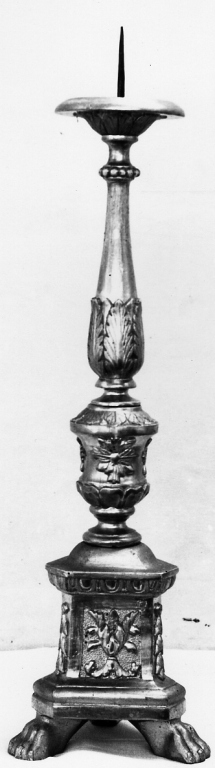 su tre zampe di leone poggia la base a tronco di piramide dagli spigoli smussati sulle cui facce sono rilevati motivi vegetali segue il gradino che congiunge con l rigonfiamento centrale con intorno tre croci raggiata; la parte superiore più liscia è come se emerge da delle foglie d'acanto