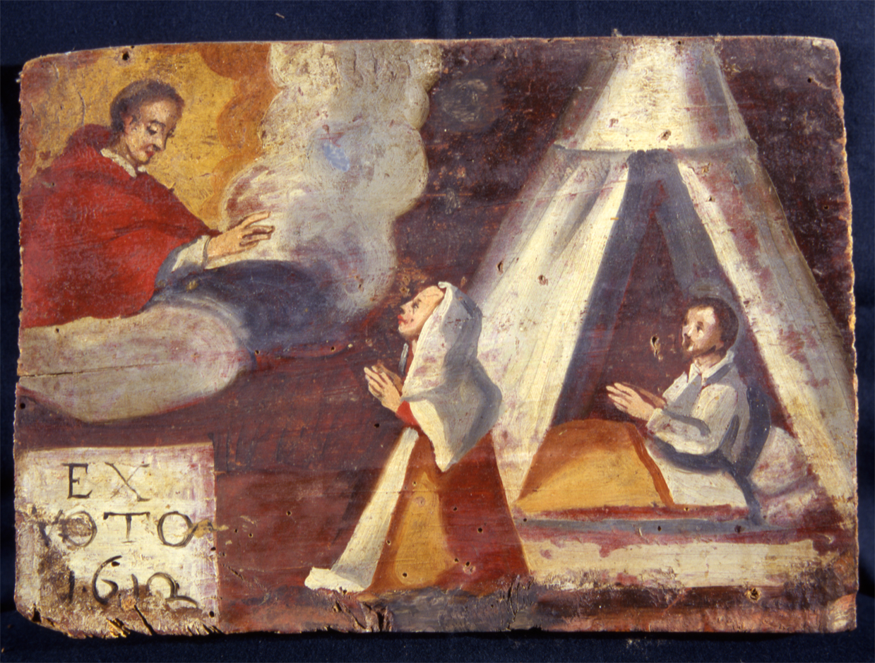 In un letto un uomo seduto con le mani giunte implora la guarigione. Accanto al letto unai donna inginocchiata prega; fra nuvole in alto a sinistra un santo