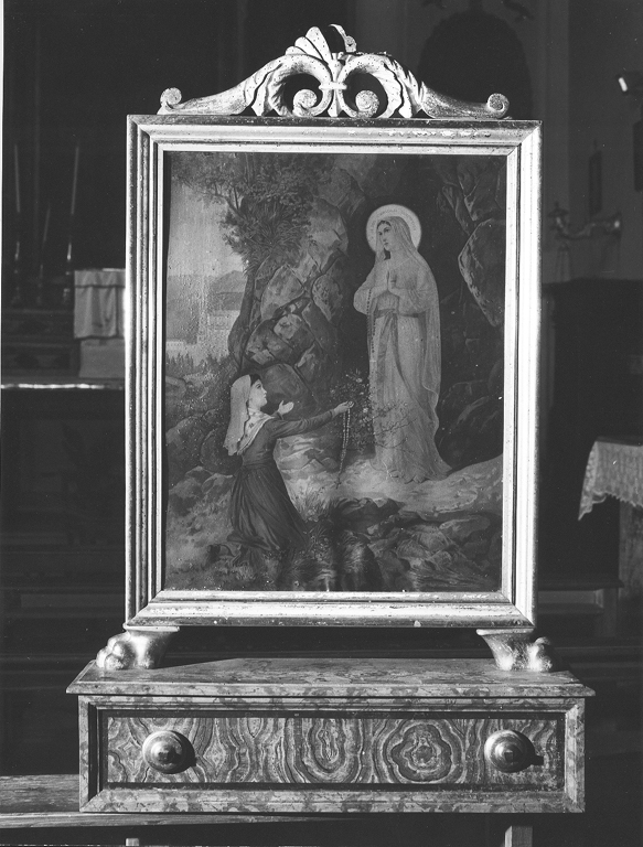 L'opera è posta su una base a forma di cassetto con due borchie quali maniglie. Al di sopra due zampette di leone sorreggono la cornice avente in alto un giglio farnesiano fra due volute. Il dipinto presenta all'esterno di una grotta dirupata la Vergine Maria in bianca veste con aureola ove sono inserite le lettere JE SUIS L'IMMACOLEE CONCEPTION. Di fronte a lei ed inginocchiata la giovinetta Bernadette, con copricapo, capelli neri, volto regolare, mani protese verso la Madonna, un rosario pende dalla destra della ragazza. Sullo sfondo veduta della chiesa di Lourdes