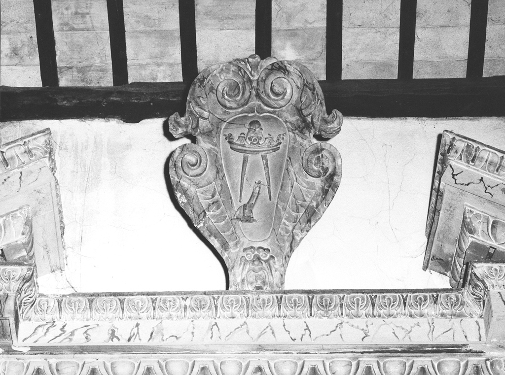 Lo stemma, posto al centro della cornice superiore dell'inquadramento d'altare, è leggermente inclinato in avanti. E' racchiuso entro un cartiglio sagomato con volute. In alto una forma a pera dalla quale digradano lungo i lati un elemento foliaceo. Il campo anch'esso riproduce una forma a pera ed ha: campo azzurro, in alto una tenaglia ed una corona, in basso sembra di intravedere una raspa