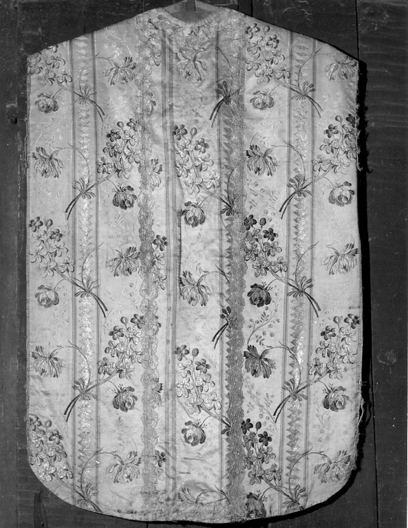 Su fondo bianco a strisce parallele mazzetti di fiori ricamati rossi e argento, due strisce verticali ricamate con losanghe. Il manufatto è tripartito da nastri di passamaneria dorata