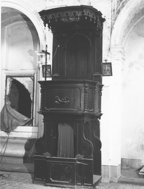 Il pulpito ha forma rettangolare a cinque specchi con ornamenti a fogliame scolpiti e applicati. Lo schienale raccorda la parte inferiore al baldacchino, che reca l'immagine dello Spirito Santo, intagliata e dorata