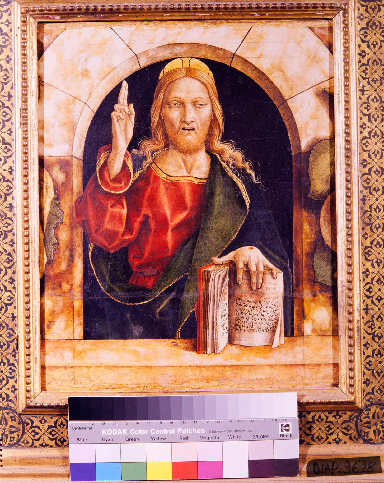 Il Cristo benedicente è posto sotto un arco in marmo e con la mano sinistra tiene un libro aperto; La tunica e il manto che il Redentore indossa sono di color rosso la prima e verde la seconda, bordati entrambi d'oro; sulla destra e sulla sinistra si notano decorazioni con frutti, quali un pomo sulla sinistra ed un cetriolo sulla destra
