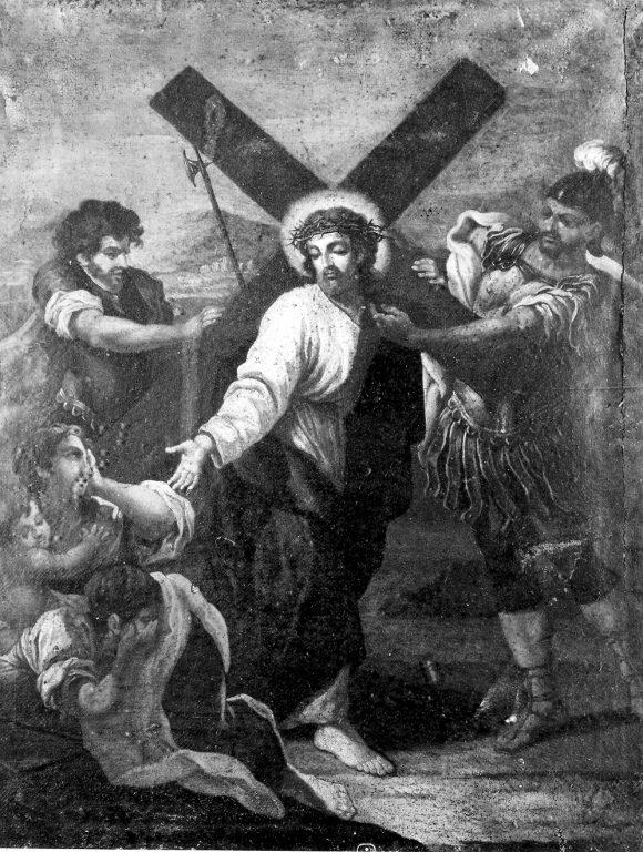 Personaggi: Gesù Cristo. Figure: soldati; donne; bambino. Armi: alabarda. Strumenti del martirio: corona di spine; croce