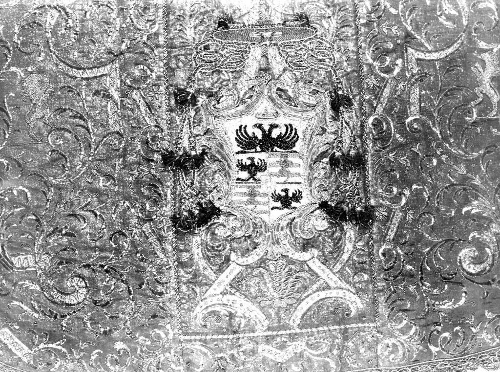 il ricamo si snoda in volute vegetali, raccordate da nastri inquadranti motivi araldici riportati sul retro in basso; un duplice nastro si avvolge a formare come dei vasi nello stolone centrale cui si intrecciano rami di palme e segni araldici