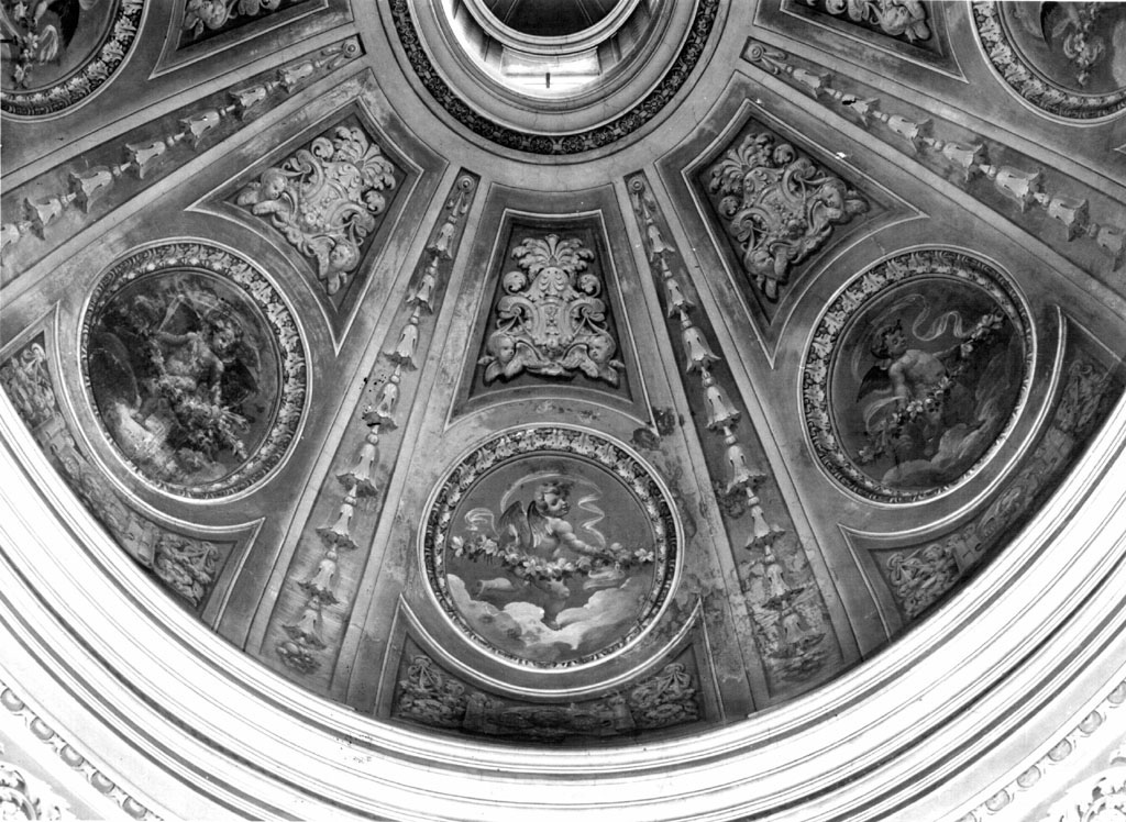 volta divisa in otto riquadri con motivi decorativi vegetali ed angioletti con fiori entro clipeo, alternati a festoni