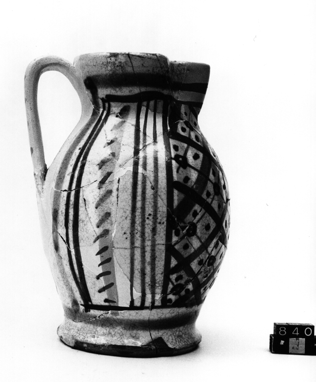 A corpo ovoidale, alto collo svasato, bocca trilobata, ansa a nastro, ricoperto da smalto stannifero bianco con decorazione in cobalto, ramina, ferraccia, giallo e manganese composta da reticoli sovrapposti, obliqui con punteggiatura negli spazi. Ai lati fasce lineari con segmenti obliqui all'interno
