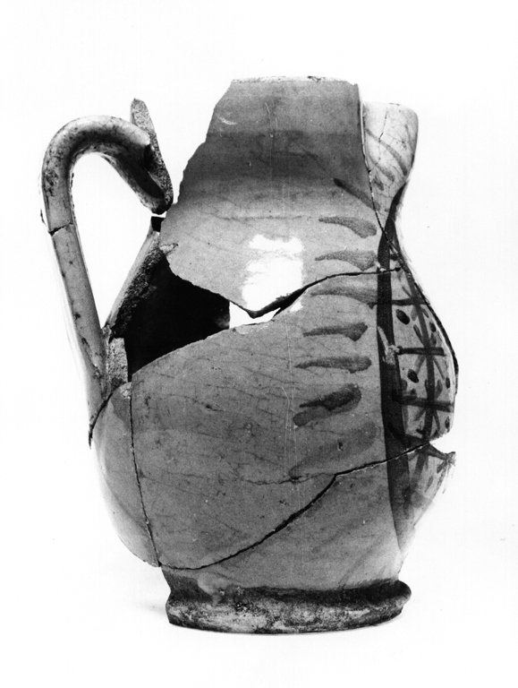 Corpo ovoidale con larga base espansa, bocca trilobata, ansa a nastro. Decorazione in blu e manganese diluita composta da un rosone campito da graticcio con X negli intrecci e pois al centro dei riquadri
