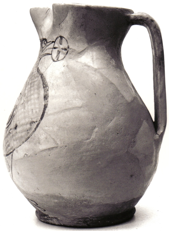 boccale a corpo piriforme larga base cercinata, collo svasato, bocca trilobata ed ansa a nastro scanalata. Superficie interna ricoperta da vetrina piombifera ocra. Superficie esterna a smalto stannifero grigio; parte inferiore a vetrina, base risparmiata. Decorazione in ramina e manganese composta da un volatile , forse un colombo,che tiene nel becco un disco con una croce