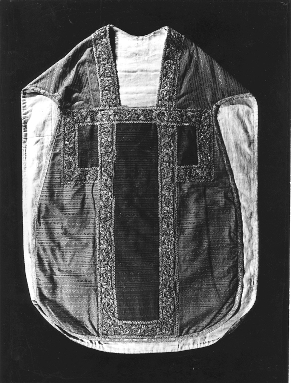 Pianeta in seta rossa con decorazione applicata in fili d'oro e d'argento, a volute ed elementi vegetali