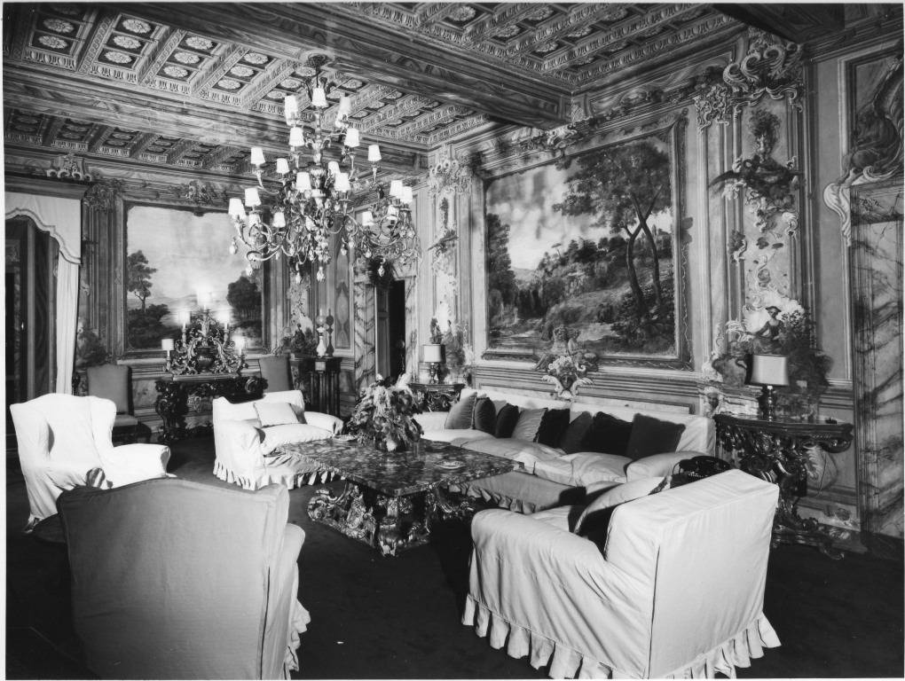 - NOTIZIE STORICO CRITICHE E' la prima sala che si incontra entrando (a sinistra della porta sulla facciata sud ovest). Coperta da un soffitto ligneo dipinto a cassettoni ha tre porte e tre finestre (una delle quali trasformata in accesso alla nuova ala, oltre la parte nord). Il gusto decorativo è composto da un tessuto lineare compatto, non plastico, che con pittoriche modulazioni unifica elementi strutturali e pareti. Massimo risalto hanno le campiture centrali con gli sfondi paesistici. Negli intervalli la decorazione evolve in episodi autonomi, una variazione libera di gusto rococò. Le matrici stilistiche vanno ricercate nel linguaggio innovatore del Rocaille francese nella fase più evoluta