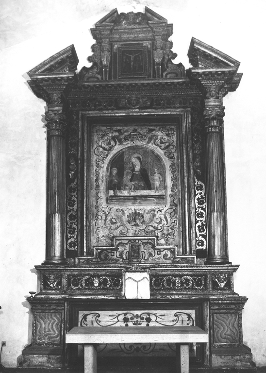 Altare con zoccoli dipinti a finto marmo giallo. Sulla cornice verde con fiori rossi, volute vegetali dorate e teste di cherubini rilevate, si innalzano le colonne scanalate e rudentate dipinte d'oro e di verde, con capitelli compositi. Trabeazione a dentelli, ovoli e rosette, su cui si innesta il timpano spezzato contenente il fastigio mistilineo ornato di teste umane e sormontato dal cherubino. I gradini del tabernacolo ripetono la decorazione affrescata al centro dell'altare