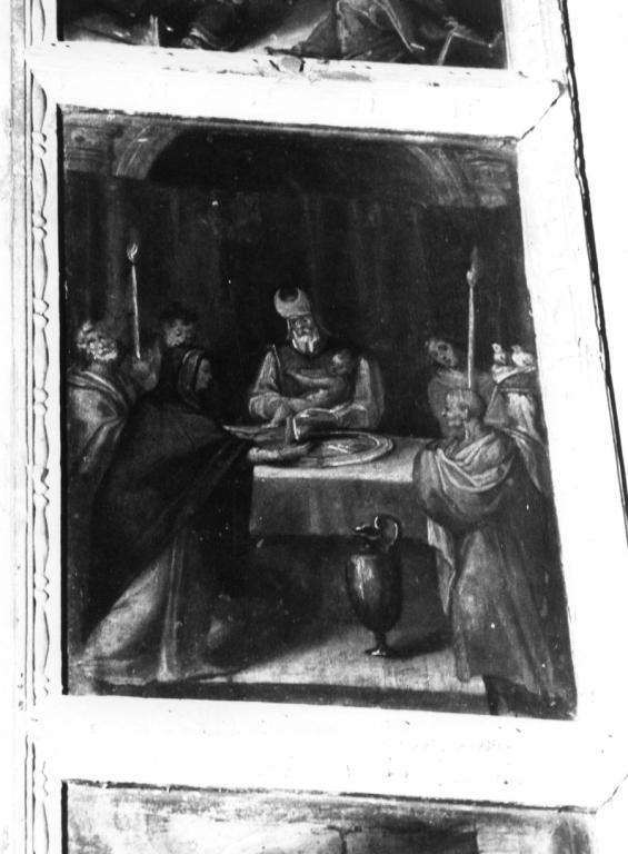 Personaggi: Madonna; san Giuseppe; Gesù Bambino. Figure: sacerdote