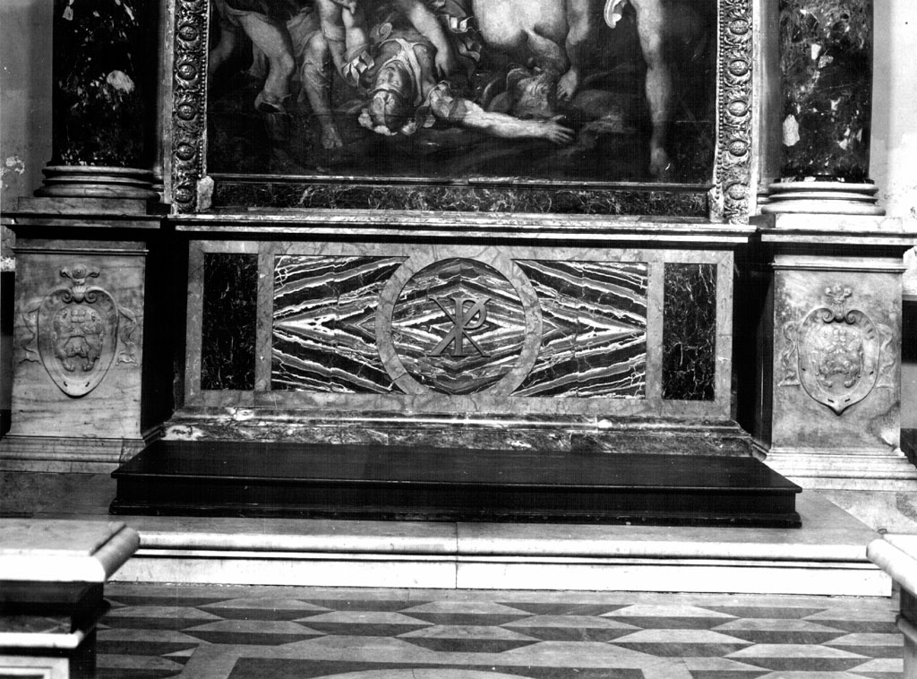 gradino singolo. Mensa a parallelepipedo con specchiatura maggiore al centro con monogramma di Cristo entro tondo e due riquadri di dimensioni minori ai lati. Due plinti con stemma al centro affiancano la mensa e sorreggono coppia di colonne a fusto liscio e capitello composito sul quale è trabeazione con iscrizione e timpano centinato spezzato decorato con cornici a ovuli e a dentelli. Lo spazio all'interno della coppia di colonne è occupato da grande pala dipinta circondata da cornice in stucco decorata da motivo a foglie