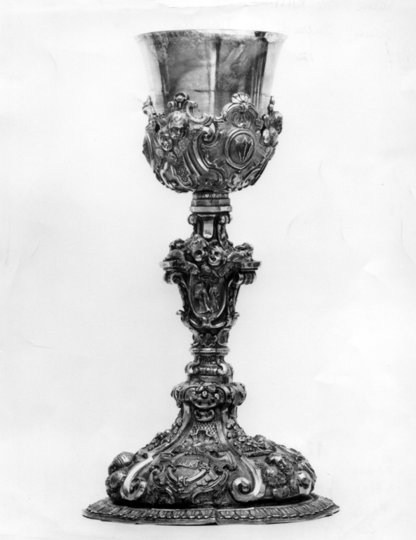 piede sagomato con decorazioni entro tre campi separati da volute, foglie e testine angeliche. All'interno sono simboli della Passione (dadi, martello, tenaglie, cartiglio con INRI). Nodo a vaso con teste di angeli e medaglioni con la veste di Cristo, velo della Veronica e colonna. Coppa a campana nella cui parte inferiore sono tre campi con i dadi; la lancia; la spugna e la coppa con l'aceto. Sotto il piede del calice è applicata una lastrina con stemma
