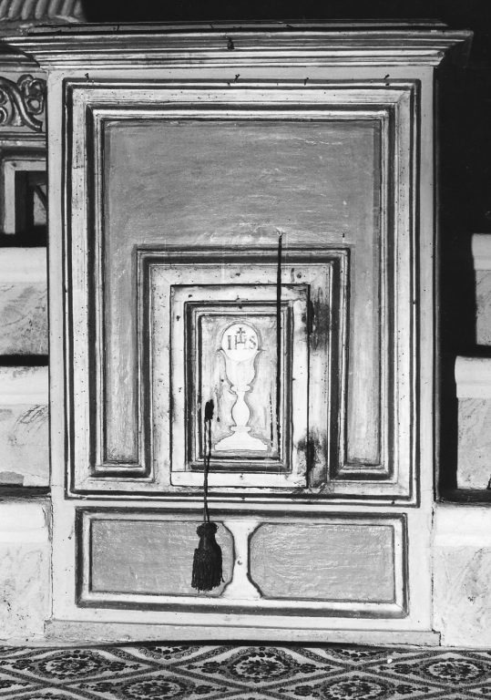 Prospetto sottolineato da una cornice che circonda tutti i lati; sportello quadrangolare dal profilo modanato ornato dal calice e il monogramma di Cristo