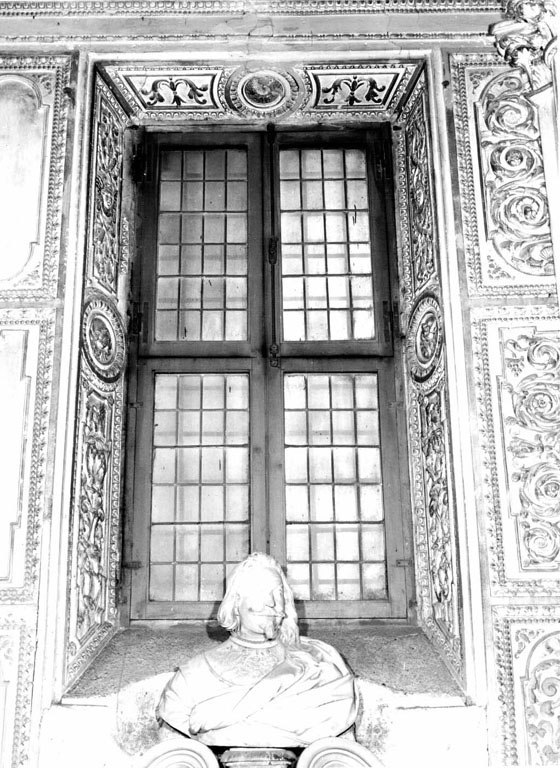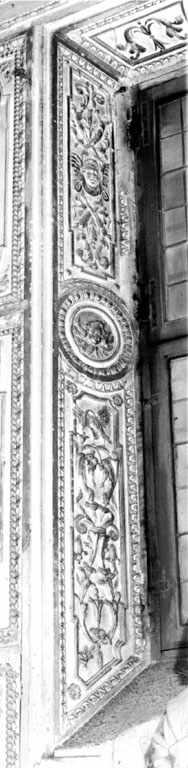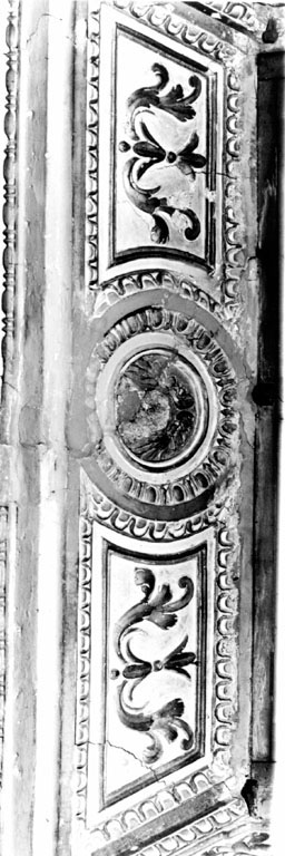 gli sguanci delle finestre ai lati dell'altare hanno specchiature decorate a motivi vegetali e, al centro, tondo con cherubino. Le pareti ai lati delle finestre sono decorate da specchiature lisce e con girali vegetali