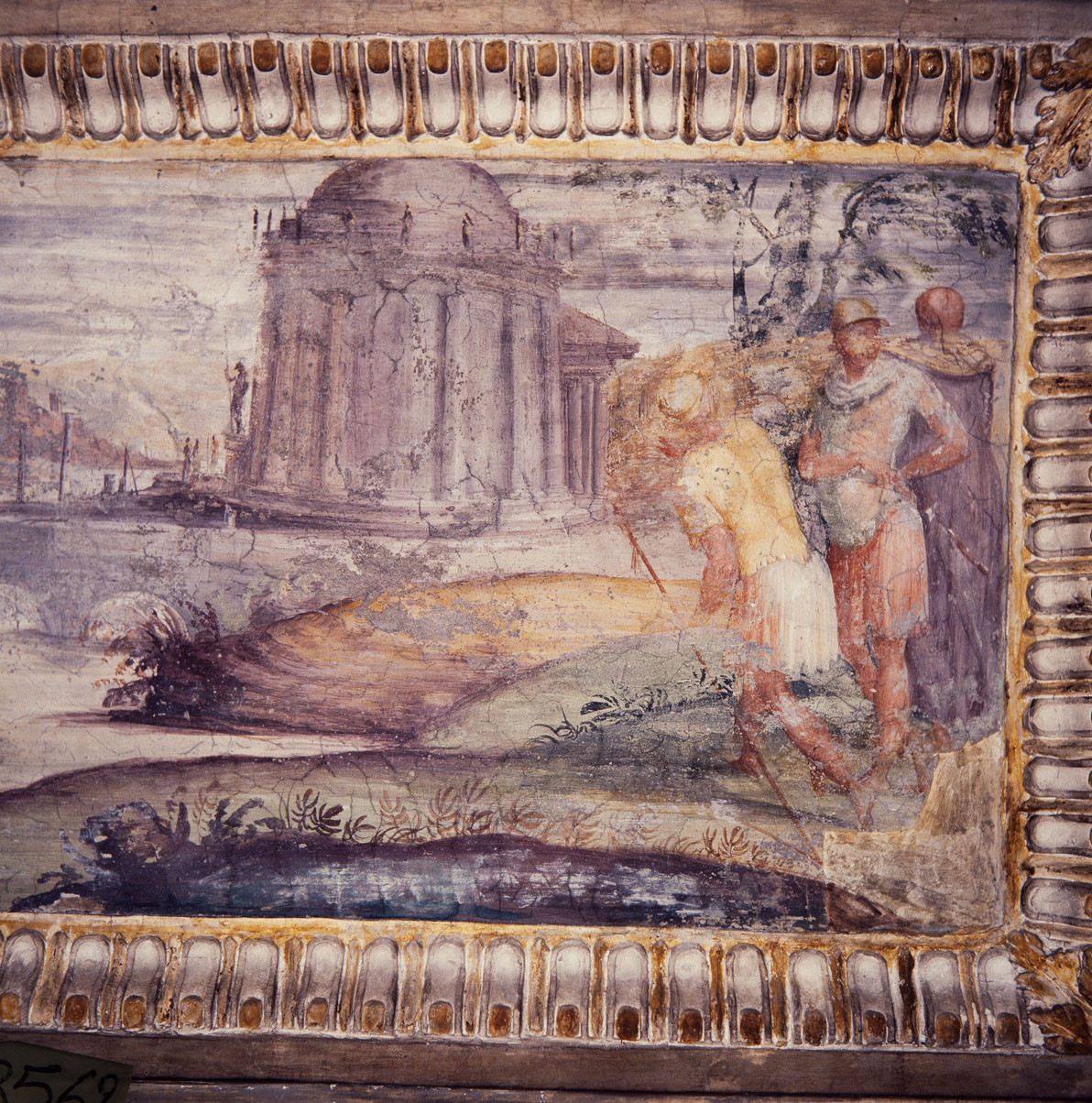 Adriano e un giovane compagno osservano un mausoleo coronato da statue; nella fascia superiore mercurio con il caduceo, il copricapo e i calzari alati, sulla destra una figura maschile mitologica